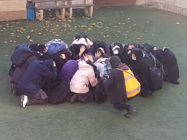 دختران گل ابتدا به صورت کامل نقاط امن و نحوه پناه گیری در کلاس درس، راهروها، راه پله ها، حیاط مدرسه و نحوه خروج را آموزش دیدند و سپس به صورت عملی اجرا کردند.